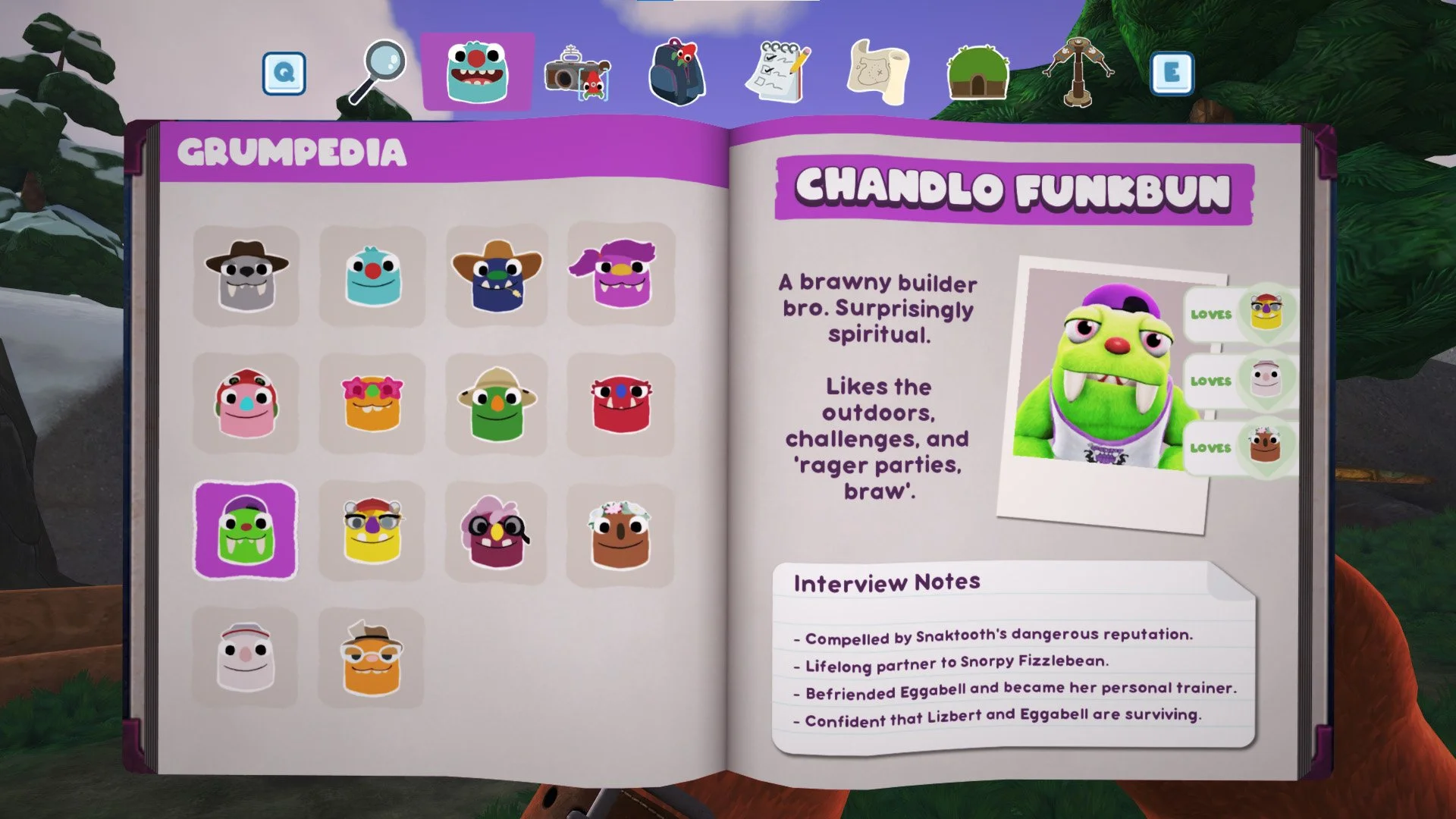 Chandlo is the brawny bodybuilder yet surprising spiritual “bro” of the Grumpus community. He loves the outdoors, sports, and is the engineer of the buildings in Snaxburg - the evolving hub world. Chandlo takes the role of the overprotective guardian of his life partner Snorpy, the brilliant yet paranoid introvert character. Chandlo’s assumption that his partner constantly needs protection emphasizes their lack of communication with each other. During quests and dialogue eventually, you will help the two overcome their insecurities and build a stronger relationship than before.
